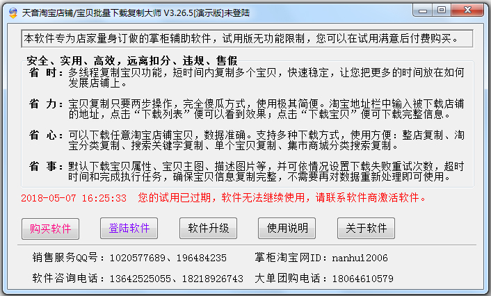 注意:本软件主要用于店铺掌柜备份、搬迁或整理本店铺数据之用,不得用于其他非法用途,否则后果自负,请认真阅读软件授权许可协议。