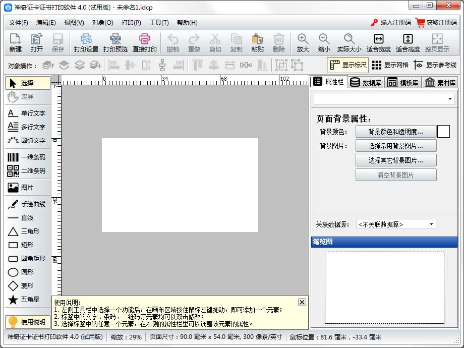 神奇证卡证书打印软件是一款界面简洁,功能出众的证卡证书制作打印软件,神功能支持打印各种条形码,二维码,可自定义内容、支持生成微信公众号二维码、自定义图片等信息,还支持文字编辑功能等。