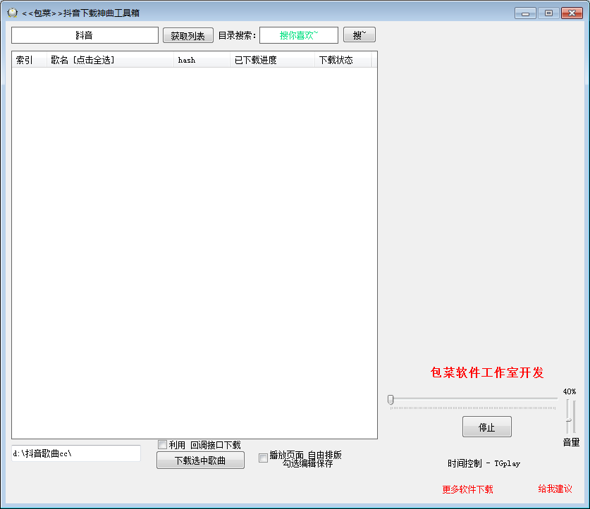 包菜抖音下载神曲工具箱是款针对抖音短视频打造的音乐BGM下载工具。它可以帮助用户下载到抖音短视频里面好听的BGM到本地电脑上,有喜欢的用户不要错过了。