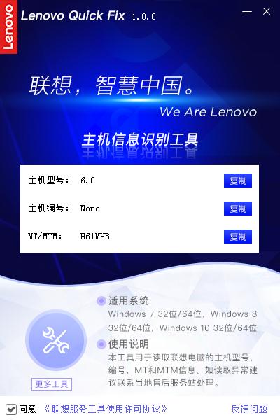 联想主机信息识别工具是联想官方推出电脑检测工具,用于读取联想电脑的主机型号,编号,MT和MTM信息,如果你买的是联想品牌电脑,那可以通过这个工具来检测你的电脑的编号,这个编号便于在售后服务时提供给客服,从而获取更精准的帮助。