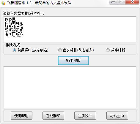 飞翼随意排是一款简单实用的古文竖排工具,用户可以通过该软件将普通的横排文字段落自动排成竖排样式,有3种竖排方式可以选择,包括普通竖排、古文竖排、逆序排版,可广泛用于古籍排版、论坛签名、个性说明等众多场合,非常方便。
