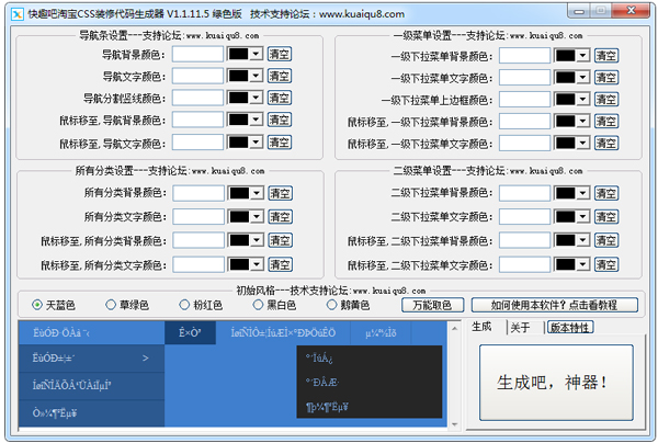 快趣吧淘宝导航css代码生成器是一款操作十分的简单的导航css代码生成工具。不但能调导航条的文字颜色,而且还拥有颜色提取器,从而更快速的生成所需要的代码!需要的朋友们可以下载试试吧!