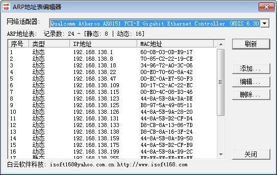 2、软件自动列出ARP地址,选择要修改的IP地址,点击编辑可修改