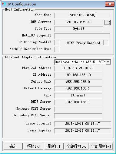 IP Configuration是一款根据Windows 98系统中winipcfg工具制作IP地址查询工具,它能够查询电脑当前的IP地址,DNS地址还有Mac地址,打开即可使用,非常的实用。