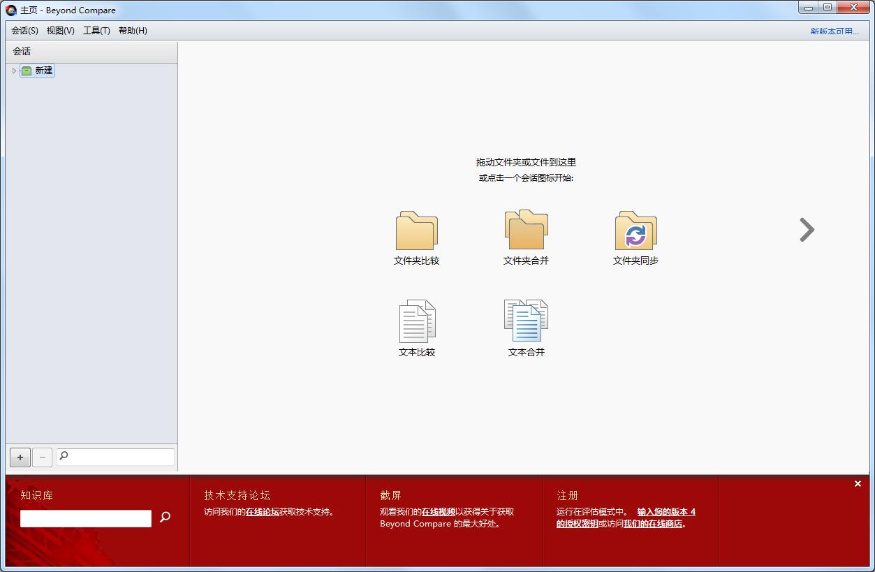 步骤一:运行Beyond Compare,在打开的主页中单击会话按钮,在展开的菜单中选择“新建会话”选项,在新建会话选项内容中选择“文本比较”会话,打开会话操作界面。