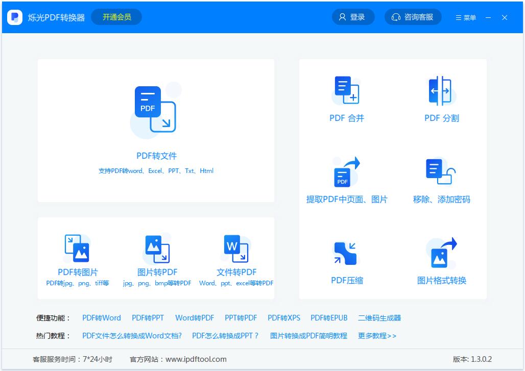 打开运行烁光PDF转换器,可以看到烁光PDF转换器的界面有几大模块的格式转换功能,我们点击左侧【PDF转文件】功能。