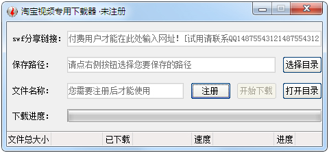 很多淘宝商家都会上传宣传广告视频,用以吸引消费者;但是这些视频没有下载地址。淘宝视频专用下载器是专门为淘宝用户研发制作的视频下载工具,此款软件能够帮助您轻松下载淘宝视频,软件操作简单,用户只需点击视频上的分享按钮,复制flash链接粘贴到下载器即可下载淘宝视频。软件需要绑定电脑,用户更换电脑时需解绑原电脑,需要的话可以来下载使用。