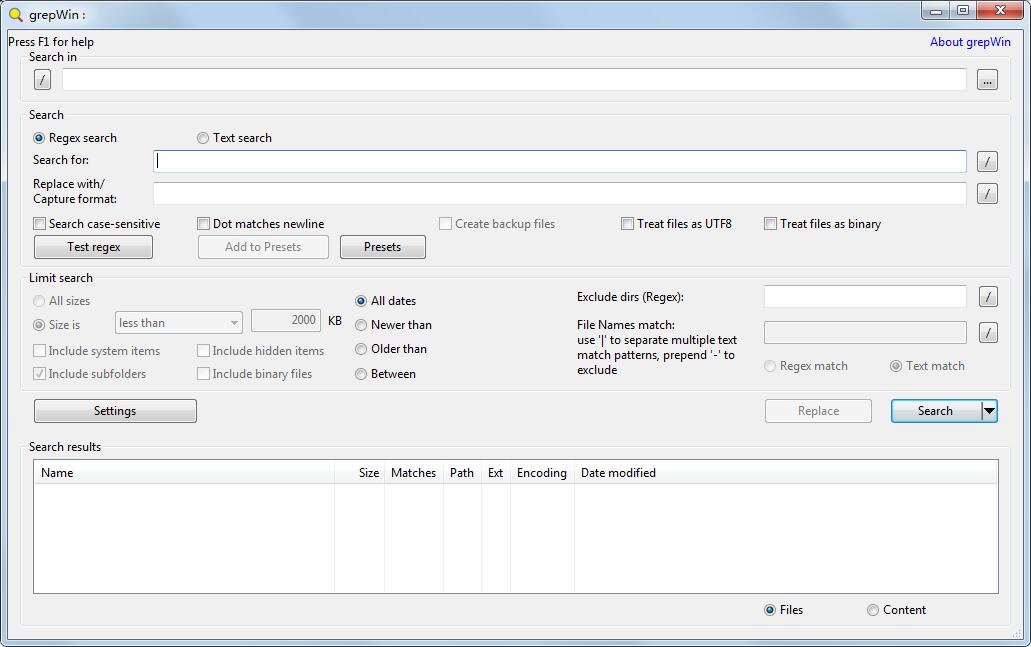 2、一旦启动,grepWin允许您自定义搜索或替换在许多方面。