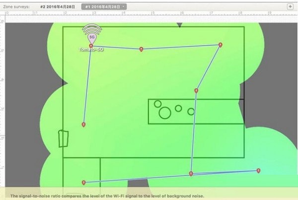 很明显一个房间内的意义不大,只有穿墙才有用…上面的 5G 信息是自动识别出来了,感觉应该是找了个信号最强的地方加上去的。注意上图右上角的加号,如果你需要不同时段的扫描结果,点一下可以在当前区域开始新的快照,并保存下来,比如早中晚各测试一次。扫描完成后,就能查看到这片区域内的 Wi-Fi 质量可视化效果图了:
