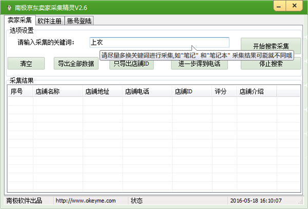 南极京东卖家采集精灵,软件功能强大,采集多线程智能化操作,只要输入关键词即能采集到京东上的相关卖家,可以获取卖家的账号,店铺地址,店铺名称,店铺介绍,店铺评分等, 同时,支持双击与卖家直接聊天互动,欢迎大家下载使用。