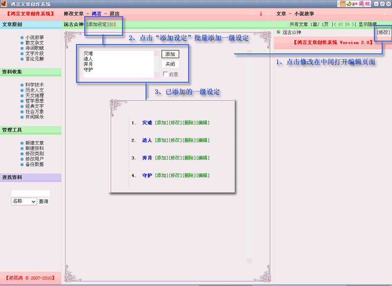 鸿言文章创作系统是一款十实用的网络小说、各类文章创作系统,界面美观,功能实用,采用的是多用户方式,用户之前可以实现文章独立,资料共享,采用树型创作方式,可以在每个节点上对文章内容进行设定,末级分支为章节的正文内容。