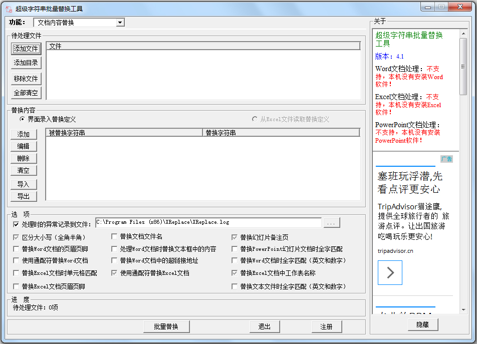 超级字符串批量替换工具是一款灰常实用的文档字符替换工具,支持文本/超文本文件,office文档:Word文件(doc)、Excel文件(xls)、PowerPoint幻灯片文件(*.ppt)的批量内容替换,这个字符替换工具不仅可批量处理多文件,也可一次批量处理多组内容替换。