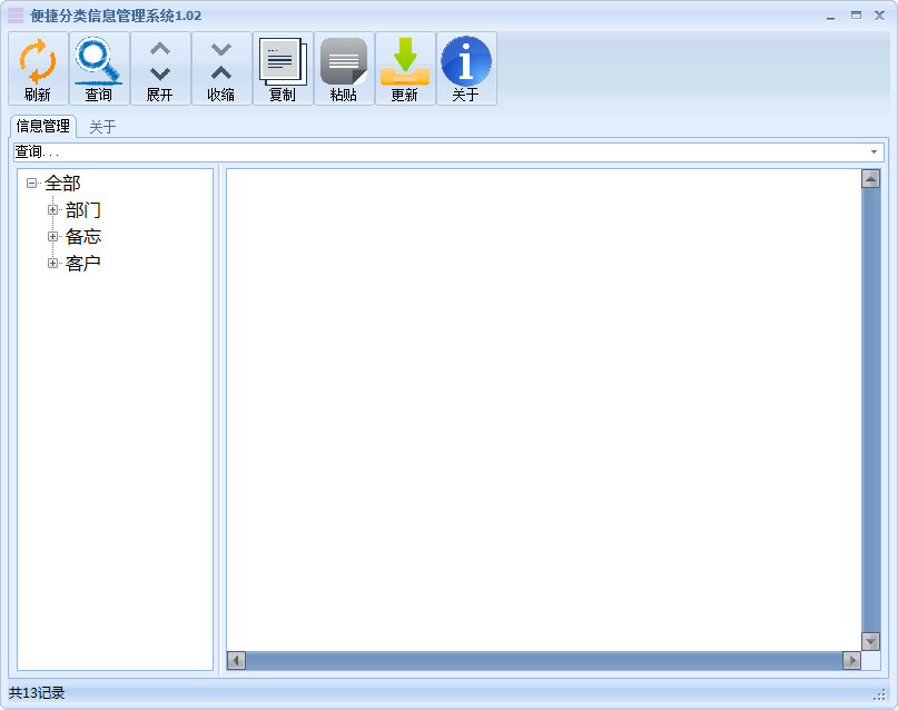 便捷分类信息管理系统是一款专门用于帮助用户进行信息管理的软件,软件支持查询、支线文档添加与管理功能,对于有非常多信息的用户来说,利用软件能够更好的管理,而且软件小巧好用,能够满足用户的大部分需求。