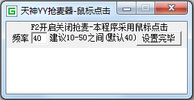 yy抢麦器采用的是鼠标连点功能!上麦成功率高于80% ,默认的按键频率为30MS!最低可设置为10MS!热键为Alt+W!抢麦时将鼠标放到抢麦的按钮上然后按下Alt+W!即会自动点击抢麦按钮!直到再次按下Alt+W后方会停止。