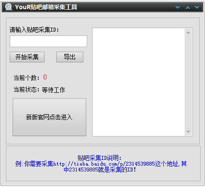 YouR贴吧邮箱采集工具是一款简单实用的贴吧邮箱采集工具,YouR贴吧邮箱采集工具功能简单,能够自动检索指向贴吧的用户邮箱数据,帮助用户快速采集邮箱信息,有需要的朋友快来下载试试吧!
