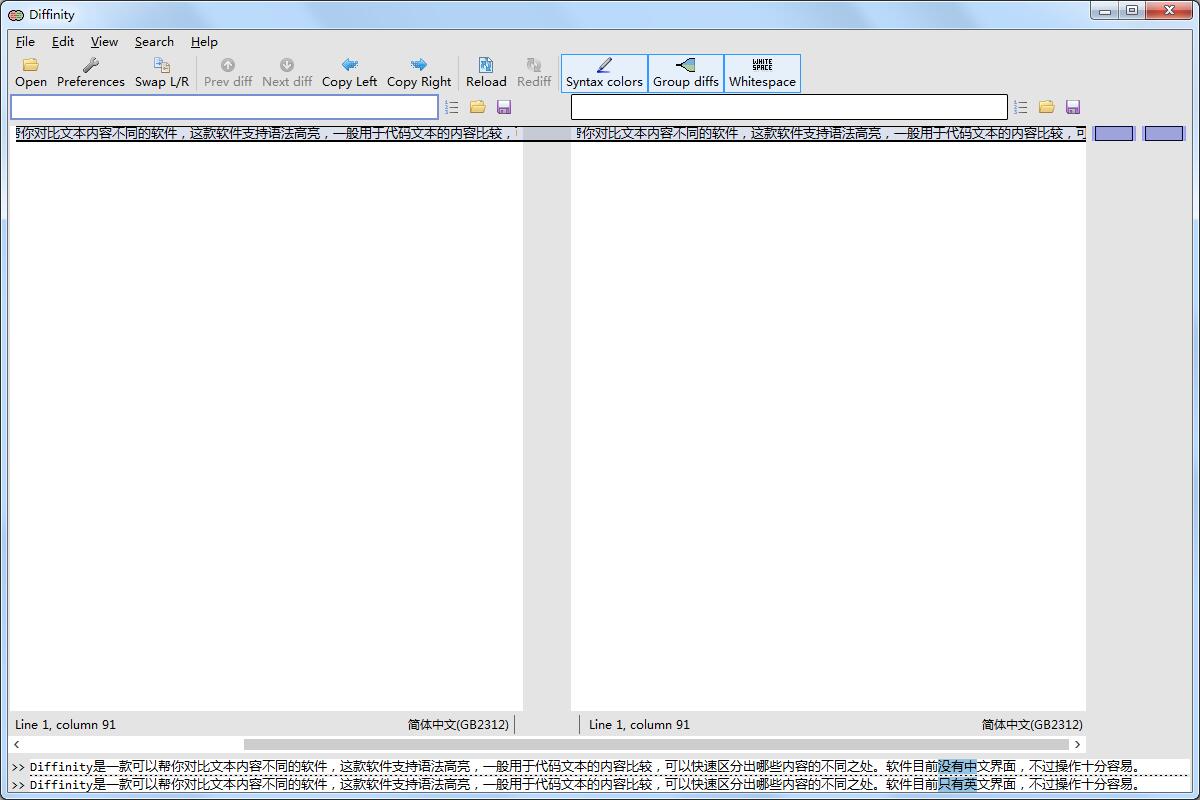 Diffinity支持语法高亮、支持显示行号、支持使用竖状滚动条样式的文本概览,支持双面板显示,所以比较的结果十分的简单明了。