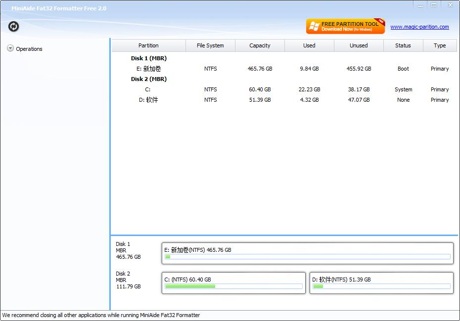 MiniAide Fat32 Formatter Free是一款简单实用的FAT32格式化软件,使用该软件能够帮助用户轻松格式FAT32磁盘,为用户的磁盘格式化提供了便利,软件提供了分区总容量、已用空间、可用空间、状态、类型等信息,满足用户的各种磁盘管理功能需求,非常好用。