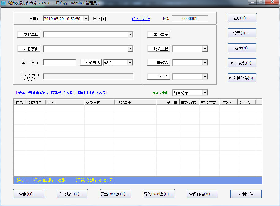 4、简洁收据打印专家免费版可对收据进行保存、修改、删除、查询统计等管理操作。