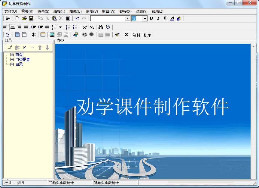 劝学课件制作软件官方版是一款非常优秀的软件,不仅适用于各学科多媒体教学、讲座、学术报告的电子版本,而且,其便捷的排版和目录的换序是编写著作、论文的好帮手,界面友好,功能强大,拥有文件,背景,符号,表格,图像,绘图,影音,链接,对象,帮助等操作功能,使用起来简单便捷。