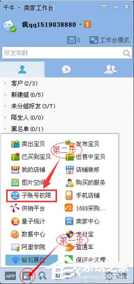 主账号登陆子账号后台—员工管理—补充权限,授权使用千牛插件。