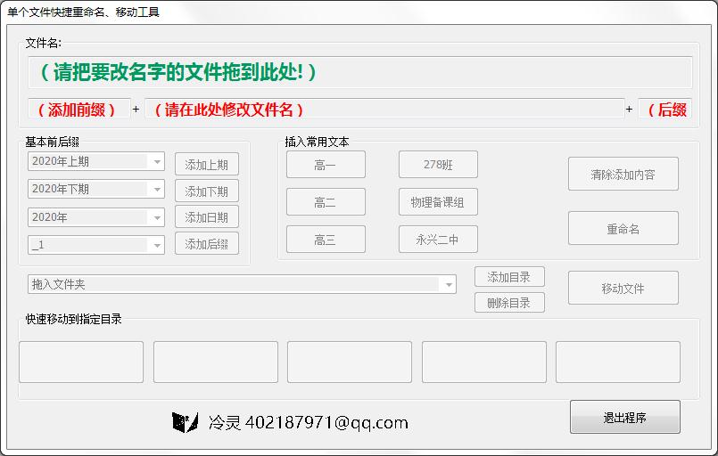 单文件快捷重命名移动工具是一款可以快速对文件进行重命名的工具,支持重命名文件、文件夹、快速修改前缀等功能,能够对一些文件进行快速的分类和重命名工作,适合教师或者文员使用。