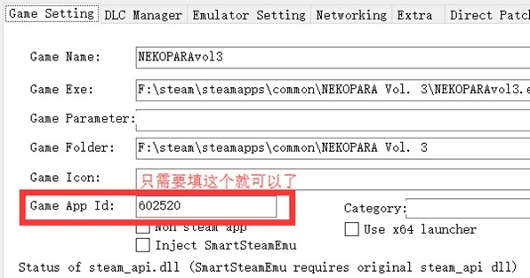 打开SSE,把需要运行的游戏exe拖到框里,然后填入Game App Id即可(这个请去steam商店查看)。