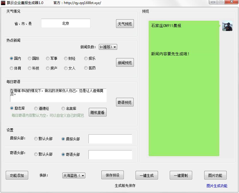 飘云企业晨报生成器是一款非常方便的晨报生成器,该软件能够从网络上采集新闻并配上自定义每日寄语,最后生成一则美观的企业晨报,让公司的员工能能够了解时事热点,也能阅读一些心灵鸡汤作为激励,让企业的每天刚开始都这么积极向上,也能提高员工的办公效率。