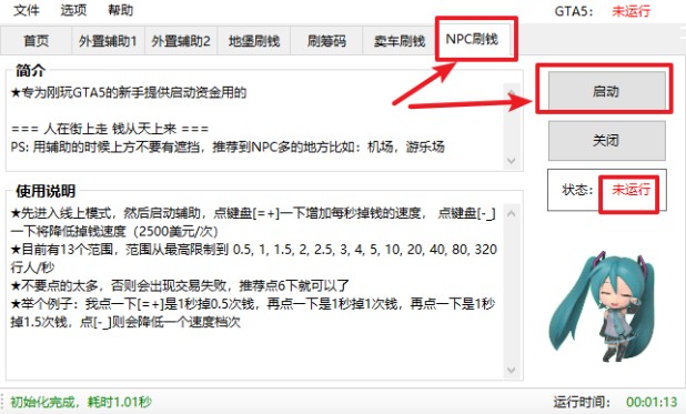 然后我们启动NPC刷钱,启动成功后,小助手里会显示已运行。