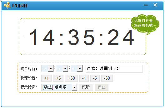 啪啪闹钟,一款在win电脑上用的小软件,软件大小1M左右,闹钟时间设置可以精确到秒,使用非常方便,程序自带2个闹铃!
