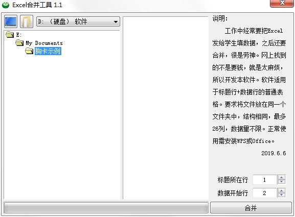 软件适用于标题行+嫩据行的普通表格。要求将文件放在同一个文件夹中,结构相同,最多26列,数据里不限。正常使用需安装WPS或Office。