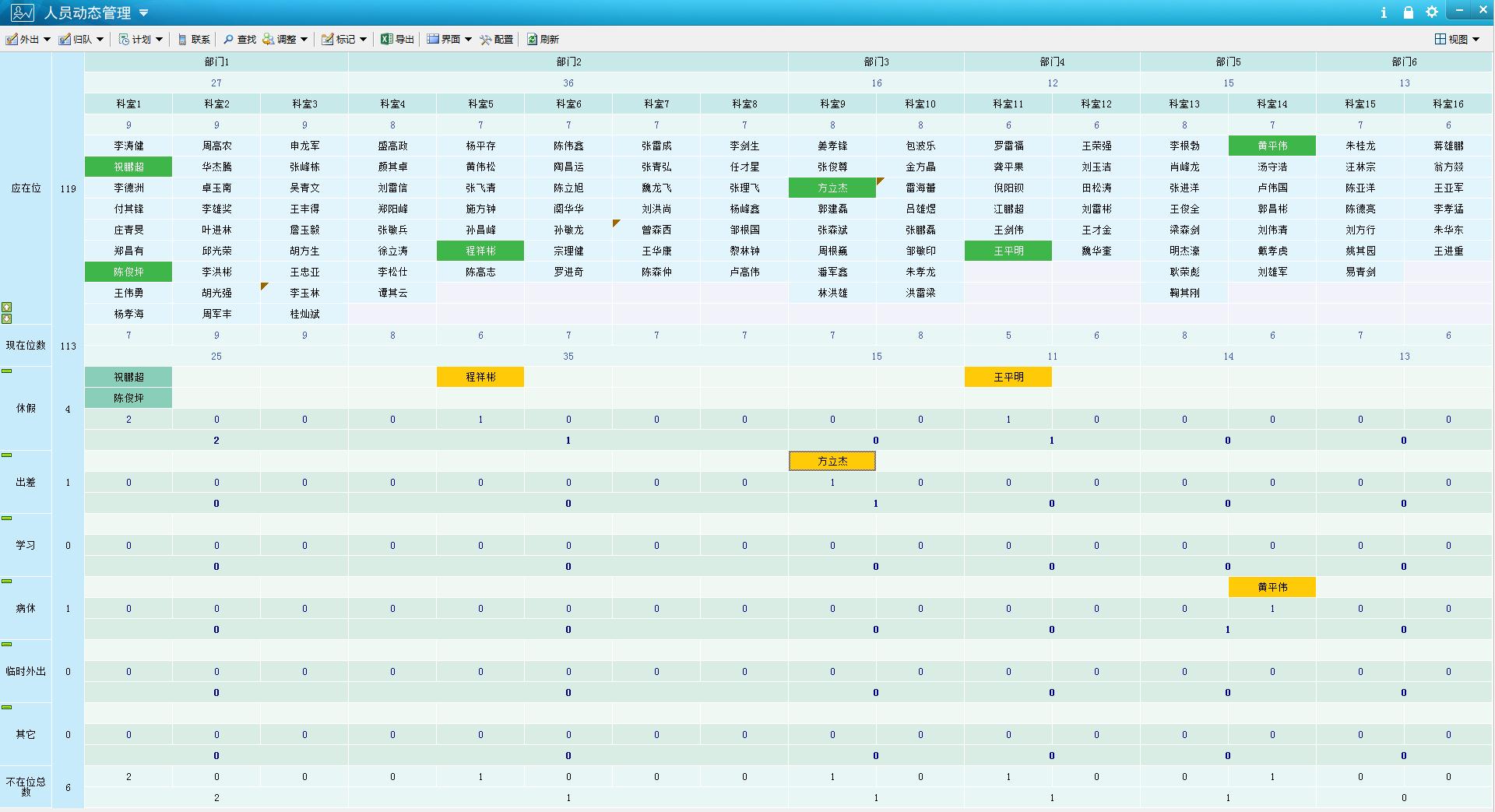 1.人员出入登记:系统既可通过操作软件进行人员出入登记,也可通过指纹采集仪或 考勤机预先采集人员的指纹(人脸)信息,在人员离队或归队时,通过录 入指纹或刷脸确认出入时间,有效提高登记效率和精准程度。系统可对 不在位人员和在位人员去向分别进行管理,将不在位人员外出类别细分 为探亲、休假、出差、临时外出等,将在位人员去向细分为开会、休息 等,便于随时掌握人员分布情况。