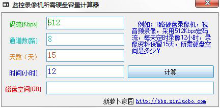 监控录像机所需硬盘容量计算器是一款能够帮助大家计算录像机所需磁盘空间的软件,界面小巧美观,功能强大实用,录像硬盘容量与天数与压缩方式、分辨率、画面质量、是否带音频等有关,只需要在监控录像机所需硬盘容量计算器中输入码流、通道数、天数和时间就能够帮助大家轻松快捷的计算出需要的容量。