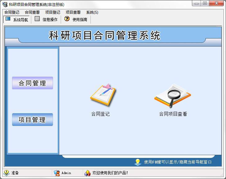 宏达科研项目合同管理系统单机版是款界面简洁大方,用途广泛,操作非常容易的科研项目合同管理工具,拥有丰富的功能,其软件支持合同登记,合同查看,项目登记等功能模块,设计非常严谨专业,具有一定科学性,满足用户的需要。