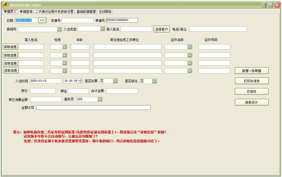 更新:收款收据打印报表格式,支持二代身份证读取功能。省去了前台服务员手写的麻烦,提高工作效率。
