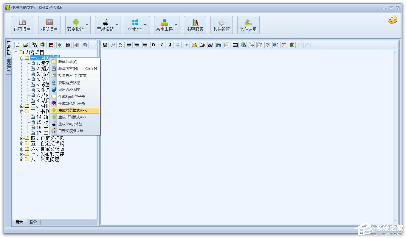 3、分类下面的一个文档节点相当于一篇文章,我们在分类下面新建两个以上的文档节点就可以生成了。生成的操作是:右键点击要生成的分类节点,在弹出的菜单中选择生成相应的格式。