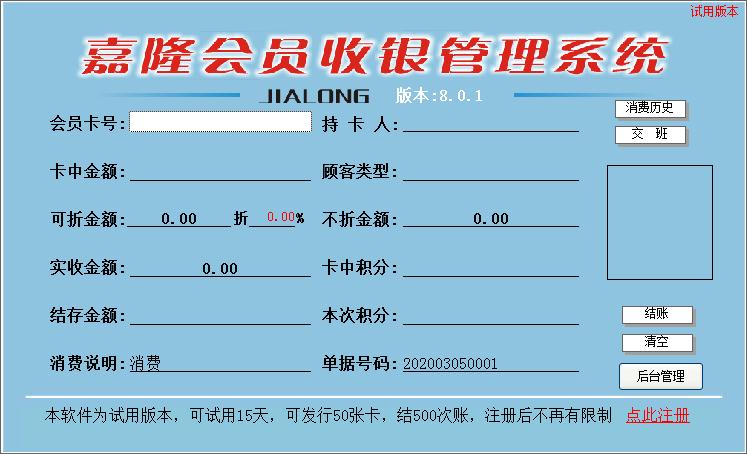 嘉隆会员收银管理系统是一款商业会员收银管理软件,包含了商品采购、商品销售、商品信息管理、仓库管理、仓库预警、仓库明细查询、客户信息、供应商信息、员工信息以及数据报表等主要功能,可以随时进行数据备份的操作,防止数据丢失。
