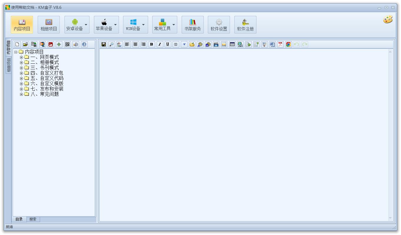 KM盒子是一款支持文字、表格、图片、音频和视频混合排版的内容型APP制作软件。软件个人版适用于制作手机电子书、个性阅读APP、APP相册等,企业版适用于制作和发布各种手机内容型APP刊物、WebAPP微刊、APP网站客户端等。
