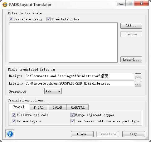 protel转pads工具款经常用于办公中的转换工具,主要用于将protel格式的封装转换成PADS格式的封装,包含PADS Layout Translator和symbol&schematic translator两个软件,也可对输出的位置进行快速的选择,也支持对文件夹选择,让用户们清晰的明白转换的位置。