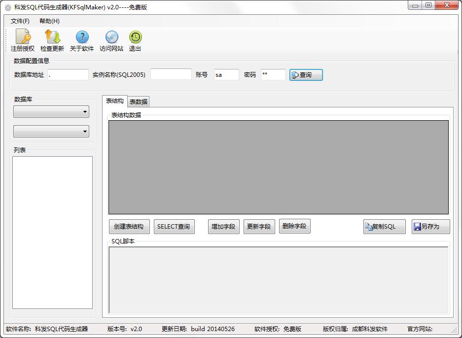 科发SQL代码生成器官方版是一款操作简单方便、功能强大的代码编辑软件,可以一键生成项目,支持自定义生成项目形式。所有生成形式全在您的掌控之中,可以用来生成数据表字段的添加、修改、删的SQL语句的代码生成软件,自动识别主键、字段类型,生成标准的Transact-SQL语句。