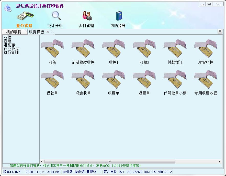 思达票据通软件是一款可以打印发票开票票据打印软件,软件里面自带的格式丰富,开单简单,打印自定义,能满足开普通收据,发票管理,进销存管理,行业收据,快递单,银行支票等日常需要。