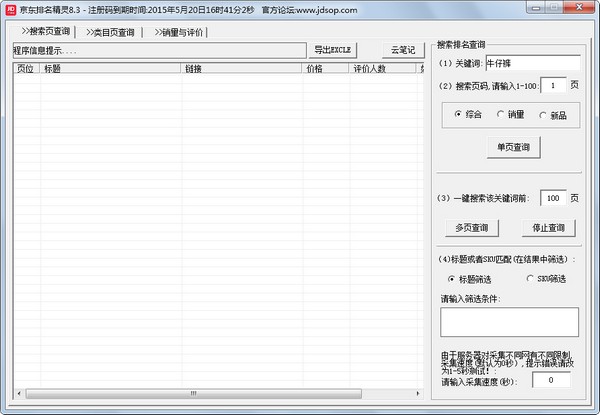 京东排名精灵是一款专门针对京东商城第三方店铺的排名优化软件,具有关键词查询和标题优化等功能,支持单页查询,支持实时监控!本软件对商家关心的宝贝在关键词排名,类目排名中的情况,提供时时查询功能。