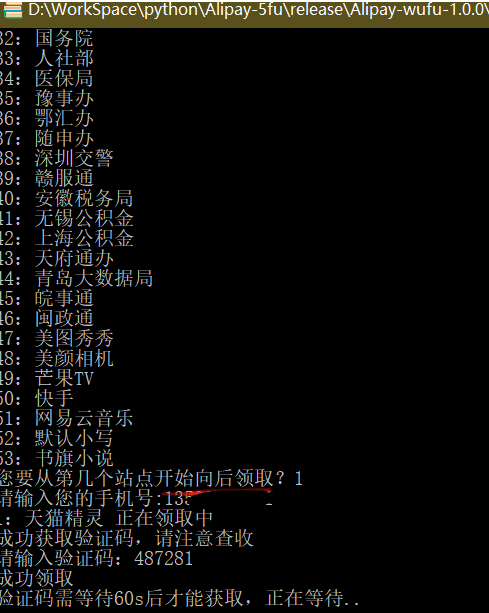 支付宝联合其他52个产品推出送五福的活动,用pyhton简单写了一个自动连续领取的程序,只需要每隔60s把手机的验证码输入即可。
