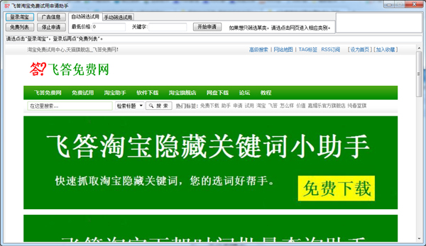 飞答淘宝试用申请助手,是一款很小的工具软件。在申请淘宝试用的过程中,它可以帮你完成 找答案、复制、粘贴等的一系列繁琐过程,从而解放您的双手,节省你的时间。