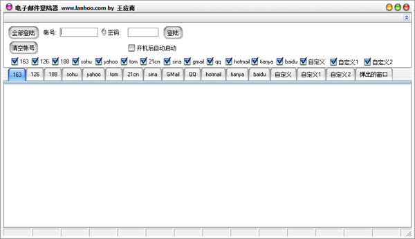 蓝弧电子邮件登陆器帮你解决由于有一些web电子邮件不支持或者禁止pop3,不能用foxmail或者outlook进行电子邮件接收的困扰。