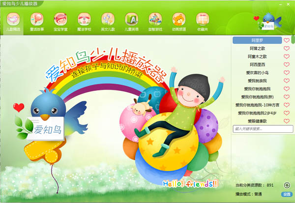 爱知鸟少儿播放器是一款亲子教育动画软件,让宝宝快乐学习,快乐成长。可以播放童话故事、英文儿歌等。