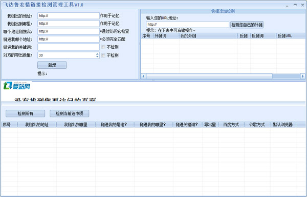 一键检测功能,让你不在为友情链接检测而费神,尤其是对于拥有大量交叉链接的站长来说,此站长工具"飞达鲁友情链接检测管理"客户端版,将是您最为重要的站长工具。