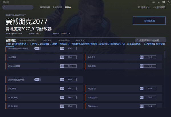 万众瞩目的赛博朋克2077是一款非常不错的角色扮演游戏,这款修改器可以为玩家们提供全部完整的游戏内容的修改,用户可以自由的在线修改参数。操作简单,这款修改器可以大大提升用户的游戏体验。快来下载体验吧!
