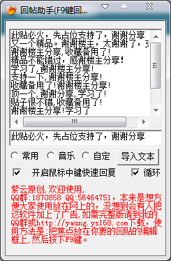 紫云原创回贴助手内置大量回帖内容,包含常用论坛回帖,音乐帖子的常用回帖,也可导入自定义文本。软件直接解压打开即可使用,绿色小巧,使用方便。