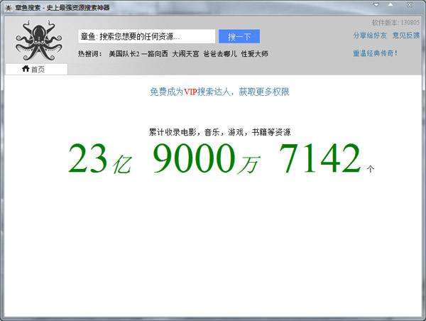 章鱼搜索从BT网络里收录了互联网中海量的电影,音乐,游戏,书籍等资源,允许用户对资源进行预览和试看,是史上最全的资源搜索引擎工具,没有之一。 像谷歌、百度等通用搜索引擎一样,章鱼搜索目前无法具备对盗版等违法资源的鉴别能力。请在法律许可范围内进行使用,禁止使用本工具进行分享和传播色情、盗版等违法资源。绿色上网,健康你我!
