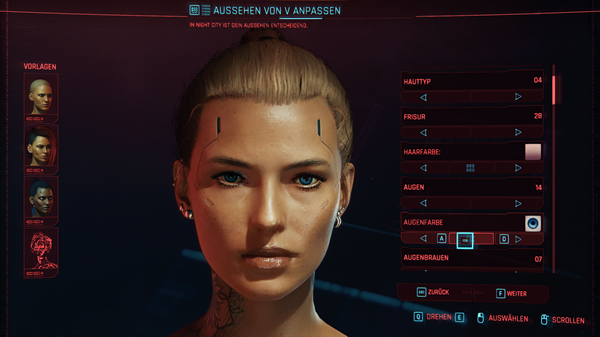 《赛博朋克2077》是知名游戏《巫师》系列开发商CD Projekt RED(简称CDPR)开发制作的一款角色扮演游戏。金发单马尾女V预设可以将游戏中人物主角的外貌改为金色长发单马尾发型,少量面部装饰但耳朵上有不少耳钉和耳环的女性外貌。
